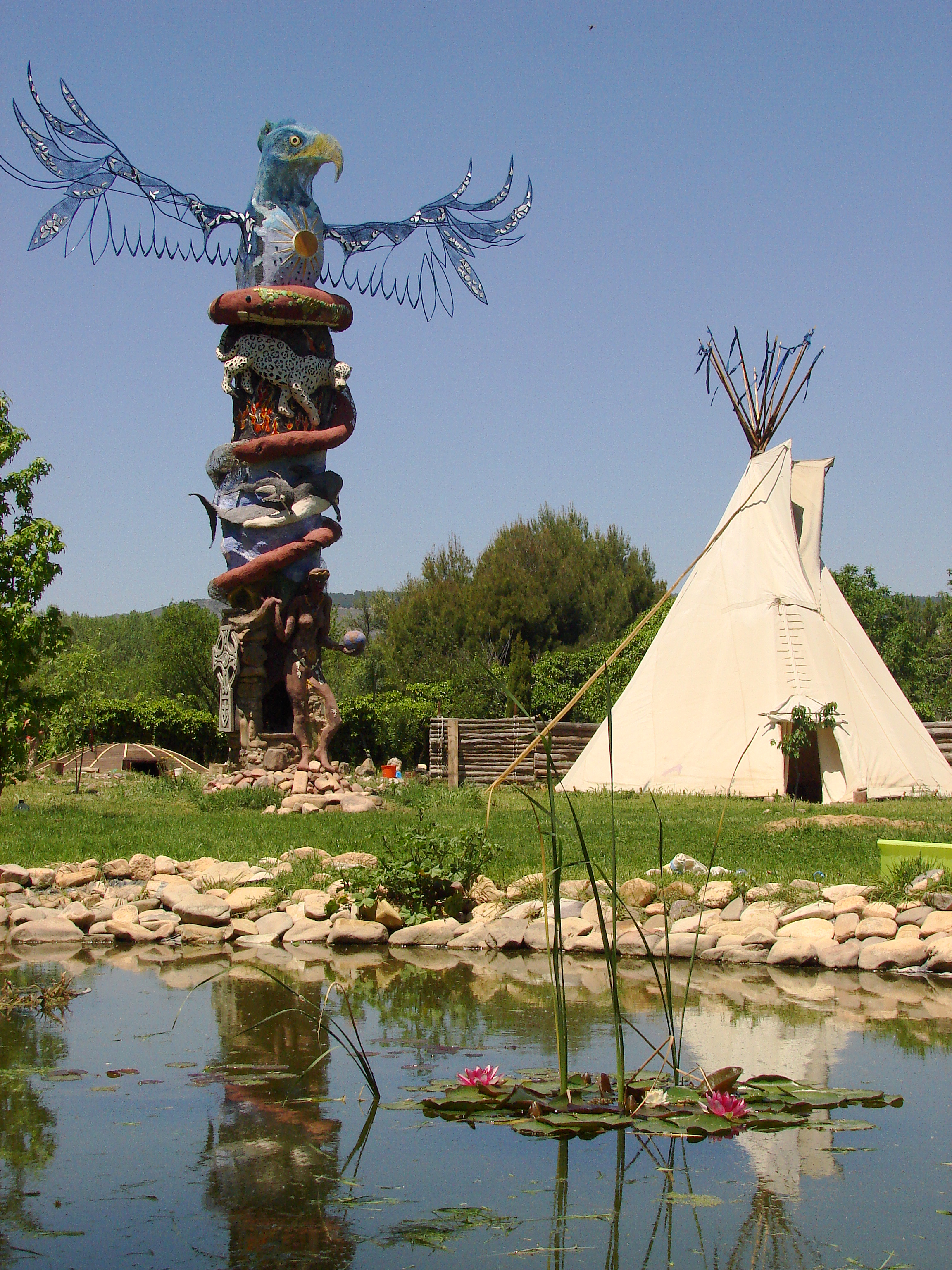 Pasaron algunos años. Soñé con un tótem alrededor del cual nos reuníamos a meditar y realizábamos ceremonias de hermandad. Eran las fechas elegidas del 2012 y el tótem jugaba el papel de antena dimensional. Sentados frente a él en silencio nos comunicábamos con otros planos de la existencia y recibíamos mensajes de los hermanos de las estrellas. Era de metal (con cristales, orgonitos, cerámica, distintos materiales orgánicos) y expresaba la presencia viva de los cuatro elementos, con fuego y agua, copal y cristal. Comuniqué el proyecto en uno de los encuentros de la Escuela Chrisgaia, y un par de artistas catalanes se sintieron implicados y con ganas para colaborar activamente. Uno de ellos, Ramón, lleva ya un año viviendo con nosotros y trabajando en su construcción. El mismo día que pusimos la estructura de metal…nuestra yegua negra con la mancha blanca en la frente, Estrella, coceó el anterior tótem de madera y lo hizo polvo, mejor dicho le hizo morder el polvo. Y así comenzó esta nueva etapa, que ha durado ya casi un año.