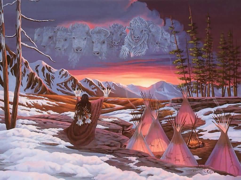 “Los Espíritus visitaron a la Abuela que dormía en la tienda de los pieles rojas, trayéndole una visión de la futura mujer de su nieto. El niño había pasado ocho inviernos y aún estaba con su madre. Aún tendrían que pasar muchos inviernos más antes de que encontrara a la mujer que daría luz a sus hijos, pero la Abuela sabía que aquello indicaba que era el momento de empezar a preparar los atavíos ceremoniales que la pareja llevaría el día de su boda.